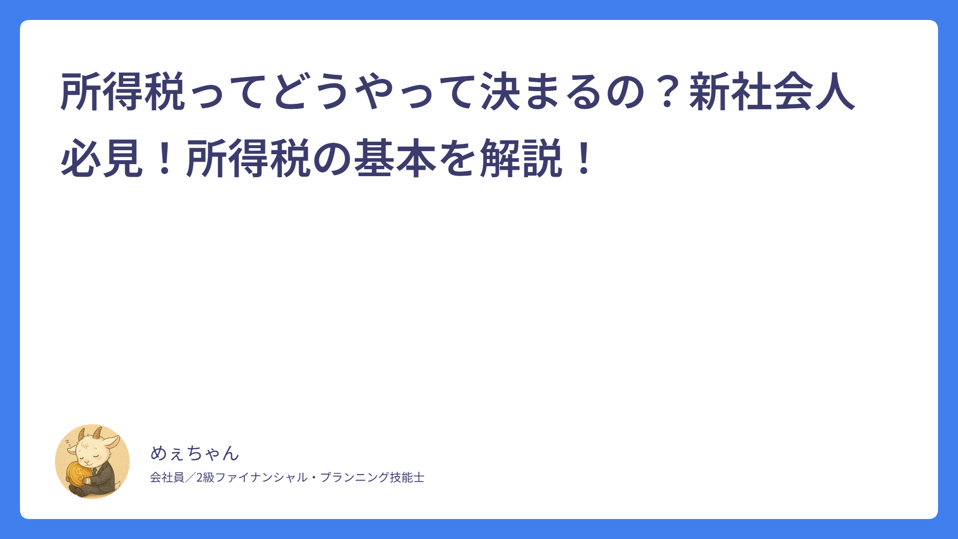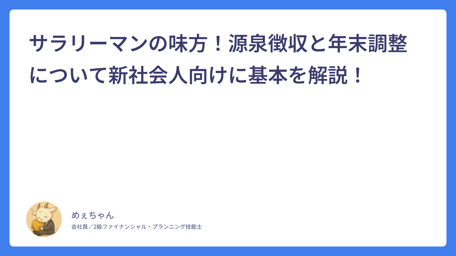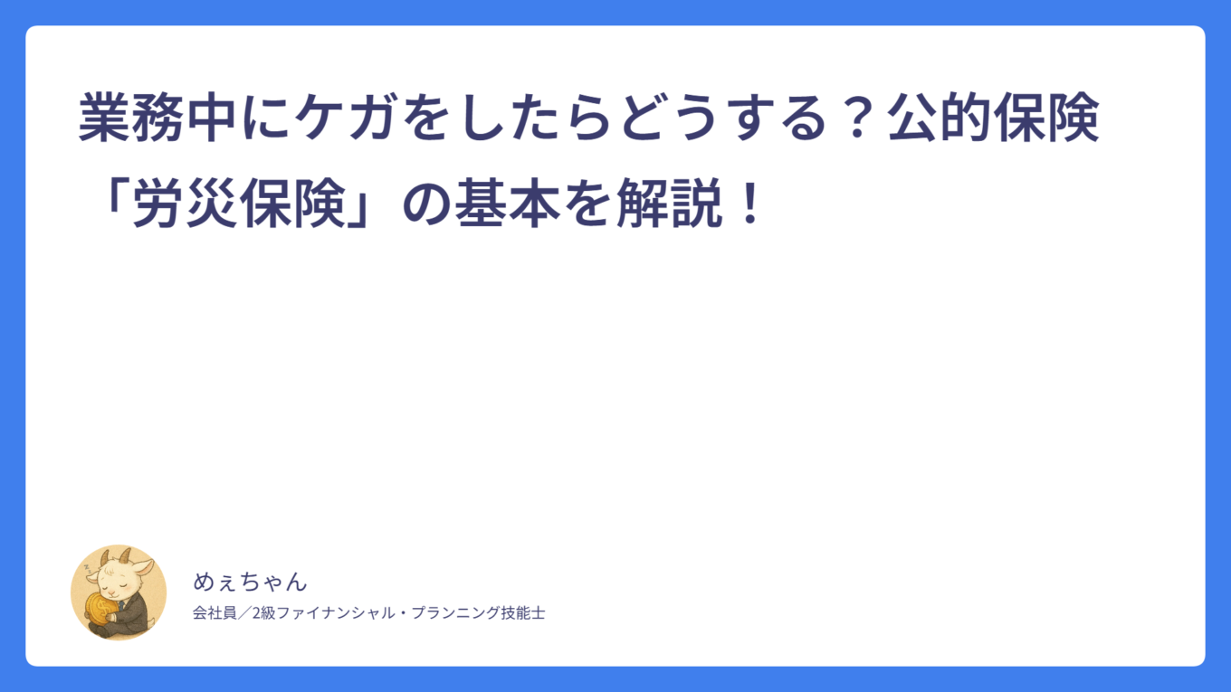 持株会って?インデックス投資とどっちがいい?メリット・デメリット含めて徹底解説! 2026.01.14 インデックス投資 めぇちゃん サラリーマンめぇちゃんのライフプランブログ 業務中にケガをしたらどうする?公的保険「労災保険」の基本を解説! 2026.01.10 労災保険 めぇちゃん サラリーマンめぇちゃんのライフプランブログ 無駄な保険に入ってない?みんなが入っている最強の保険「公的医療保険」の基本を解説! 2026.01.03 医療保険 めぇちゃん サラリーマンめぇちゃんのライフプランブログ iDeCoって?NISAと何が違う?初心者向けに徹底説明! 2025.12.28 iDeCo めぇちゃん サラリーマンめぇちゃんのライフプランブログ NISAって?初心者向けに徹底解説! 2025.12.20 NISA めぇちゃん サラリーマンめぇちゃんのライフプランブログ サラリーマンの味方!源泉徴収と年末調整について新社会人向けに基本を解説! 2025.12.14 税金 めぇちゃん サラリーマンめぇちゃんのライフプランブログ 所得税ってどうやって決まるの?新社会人必見!所得税の基本を解説! 2025.12.06 税金 めぇちゃん サラリーマンめぇちゃんのライフプランブログ はじめまして!サラリーマンのめぇちゃんです! 2025.11.29 その他 めぇちゃん サラリーマンめぇちゃんのライフプランブログ
