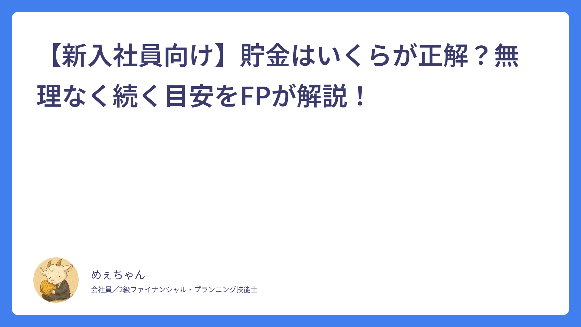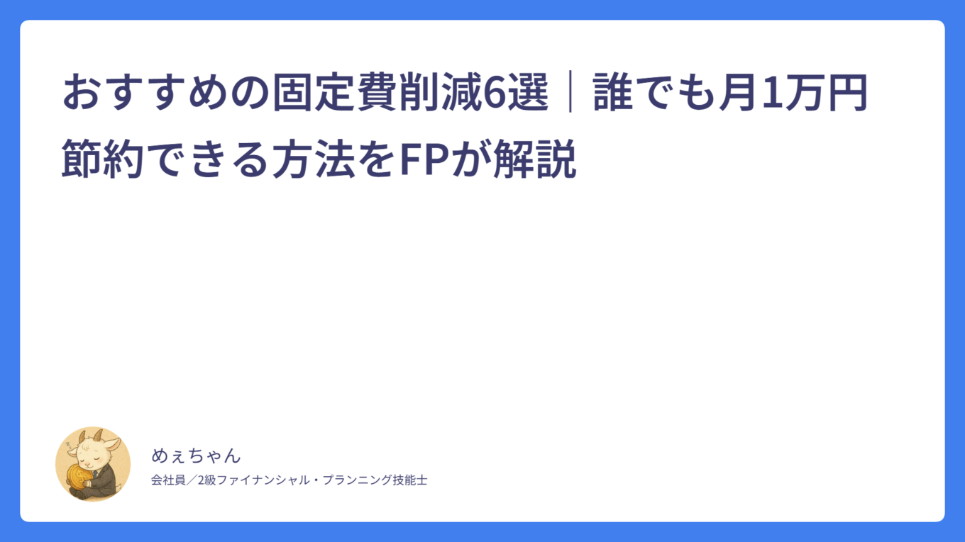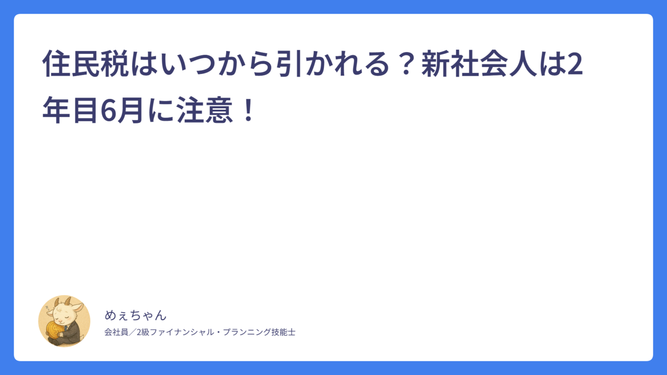 住民税はいつから引かれる?新社会人は2年目6月に注意! 2026.03.01 税金 めぇちゃん サラリーマンFPめぇちゃんのライフプランブログ おすすめの固定費削減6選|誰でも月1万円節約できる方法をFPが解説 2026.02.23 家計管理 めぇちゃん サラリーマンFPめぇちゃんのライフプランブログ 銀行口座はどう分ける?|お金が貯まる口座の分け方とおすすめ構成をFPが解説 2026.02.14 家計管理 めぇちゃん サラリーマンFPめぇちゃんのライフプランブログ 【新人・若手社員向け】家計管理は「これだけ」でOK|FPが教えるシンプル管理法 2026.02.08 家計管理 めぇちゃん サラリーマンFPめぇちゃんのライフプランブログ 【新入社員向け】貯金はいくらが正解?無理なく続く目安をFPが解説! 2026.02.02 新入社員 めぇちゃん サラリーマンFPめぇちゃんのライフプランブログ 【新入社員向け】なぜか貯金できない…原因はこの3つ! 2026.01.30 新入社員 めぇちゃん サラリーマンFPめぇちゃんのライフプランブログ 給与明細がわからない新入社員へ|控除の意味をFP2級が解説 2026.01.27 新入社員 めぇちゃん サラリーマンFPめぇちゃんのライフプランブログ 新入社員が最初に知っておくべき「お金の基本」5つ【FP2級が解説】 2026.01.25 基本 めぇちゃん サラリーマンFPめぇちゃんのライフプランブログ 誰でも簡単!ふるさと納税について初めて人向けに超基本から解説! 2026.01.21 ふるさと納税 めぇちゃん サラリーマンFPめぇちゃんのライフプランブログ 持株会って?インデックス投資とどっちがいい?FP目線で徹底解説! 2026.01.14 持株会 めぇちゃん サラリーマンFPめぇちゃんのライフプランブログ もっと見る