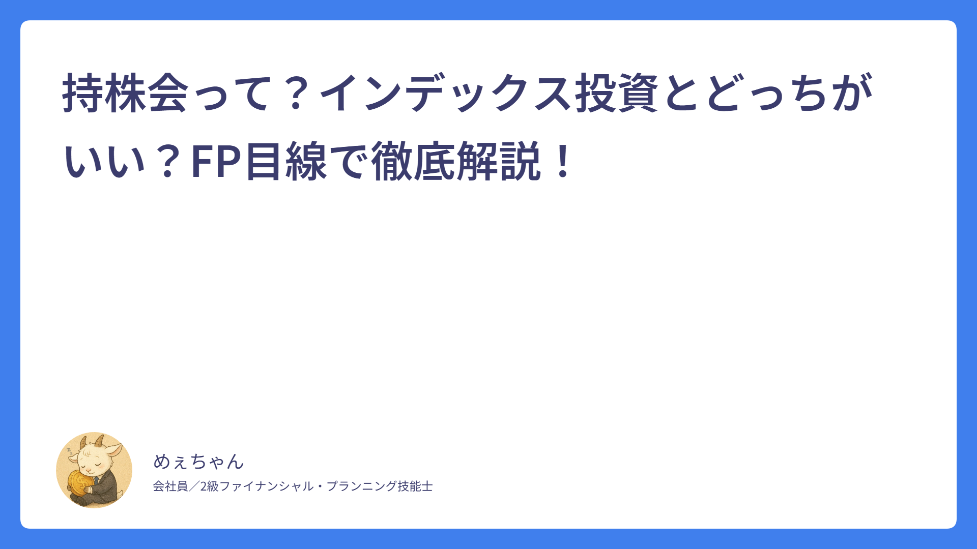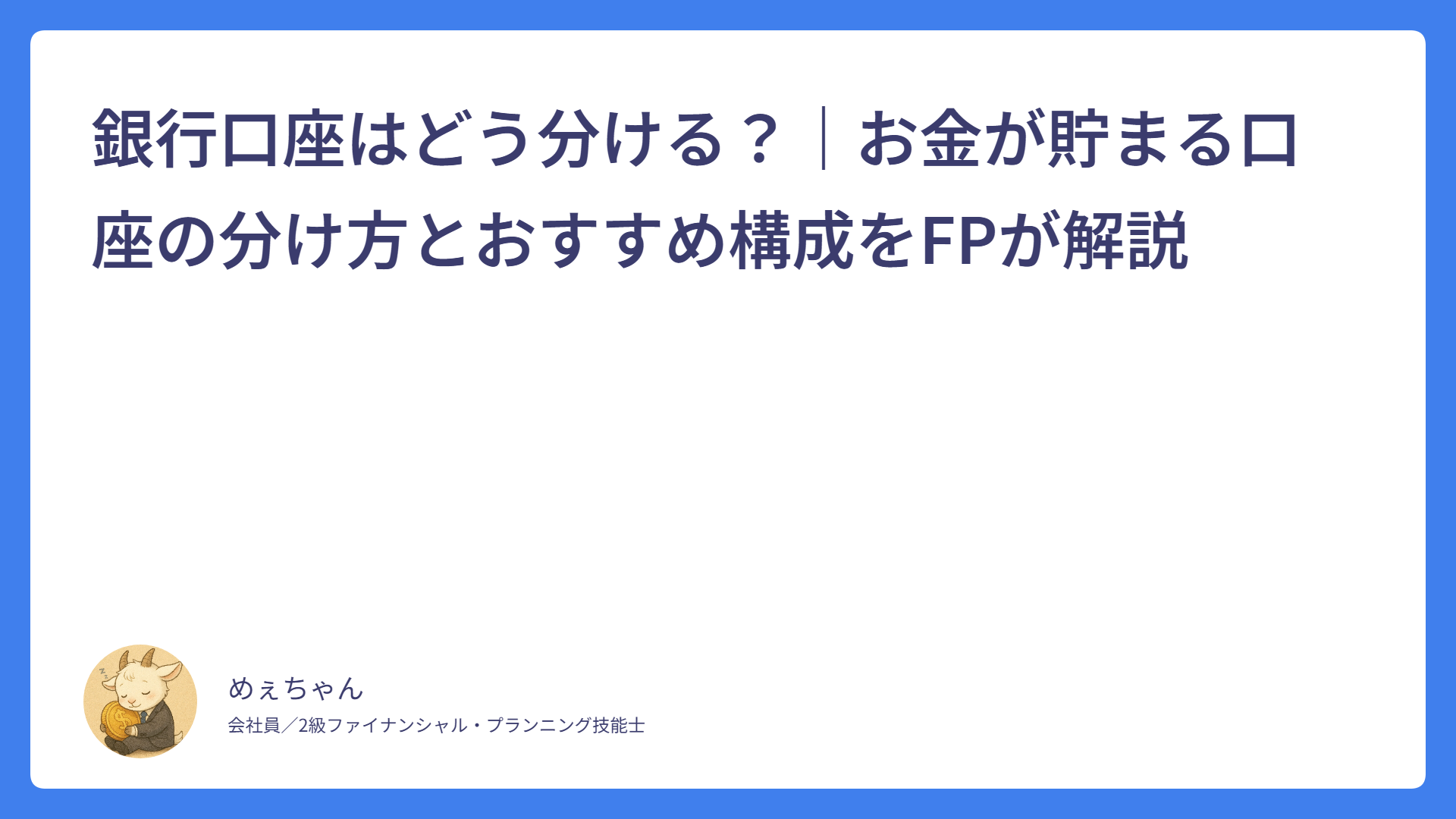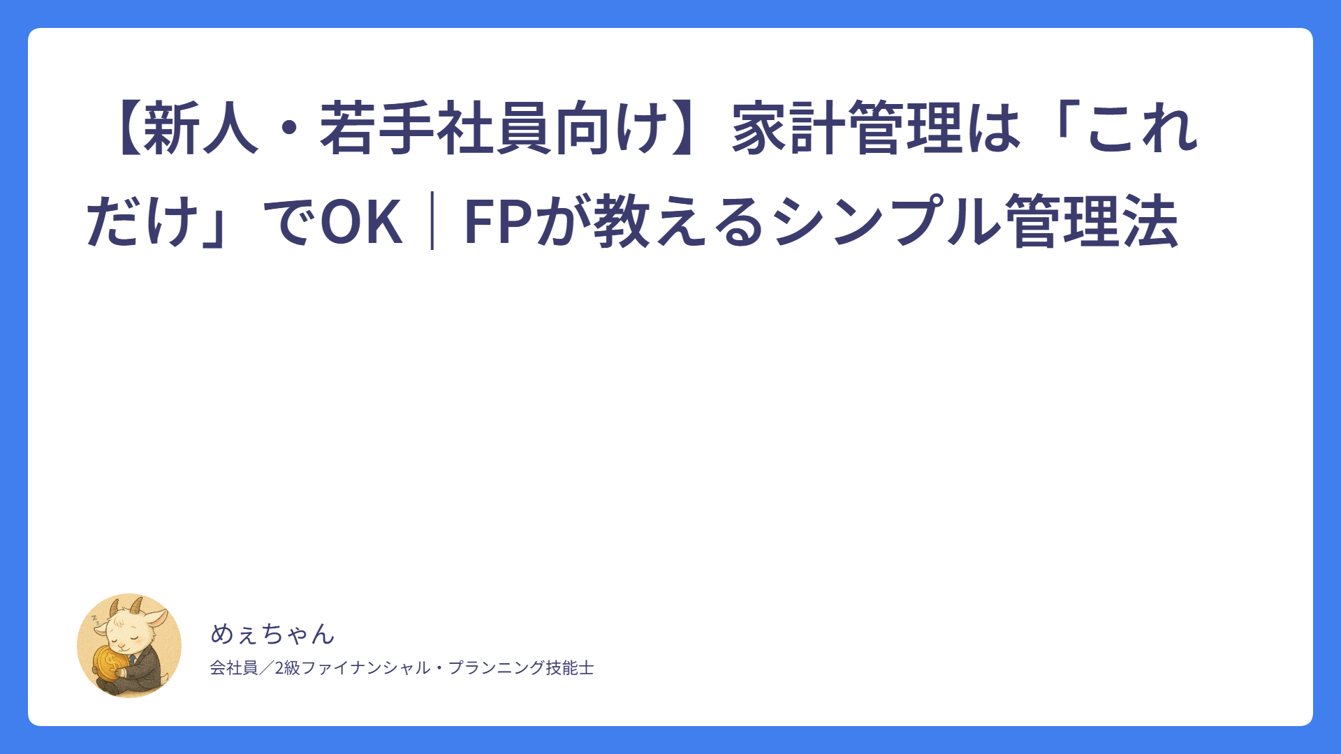 住民税はいつから引かれる?新社会人は2年目6月に注意! 2026.03.01 税金 めぇちゃん サラリーマンFPめぇちゃんのライフプランブログ おすすめの固定費削減6選|誰でも月1万円節約できる方法をFPが解説 2026.02.23 家計管理 めぇちゃん サラリーマンFPめぇちゃんのライフプランブログ 銀行口座はどう分ける?|お金が貯まる口座の分け方とおすすめ構成をFPが解説 2026.02.14 家計管理 めぇちゃん サラリーマンFPめぇちゃんのライフプランブログ 【新人・若手社員向け】家計管理は「これだけ」でOK|FPが教えるシンプル管理法 2026.02.08 家計管理 めぇちゃん サラリーマンFPめぇちゃんのライフプランブログ 【新入社員向け】貯金はいくらが正解?無理なく続く目安をFPが解説! 2026.02.02 新入社員 めぇちゃん サラリーマンFPめぇちゃんのライフプランブログ 【新入社員向け】なぜか貯金できない…原因はこの3つ! 2026.01.30 新入社員 めぇちゃん サラリーマンFPめぇちゃんのライフプランブログ 給与明細がわからない新入社員へ|控除の意味をFP2級が解説 2026.01.27 新入社員 めぇちゃん サラリーマンFPめぇちゃんのライフプランブログ 新入社員が最初に知っておくべき「お金の基本」5つ【FP2級が解説】 2026.01.25 基本 めぇちゃん サラリーマンFPめぇちゃんのライフプランブログ 誰でも簡単!ふるさと納税について初めて人向けに超基本から解説! 2026.01.21 ふるさと納税 めぇちゃん サラリーマンFPめぇちゃんのライフプランブログ 持株会って?インデックス投資とどっちがいい?FP目線で徹底解説! 2026.01.14 持株会 めぇちゃん サラリーマンFPめぇちゃんのライフプランブログ もっと見る