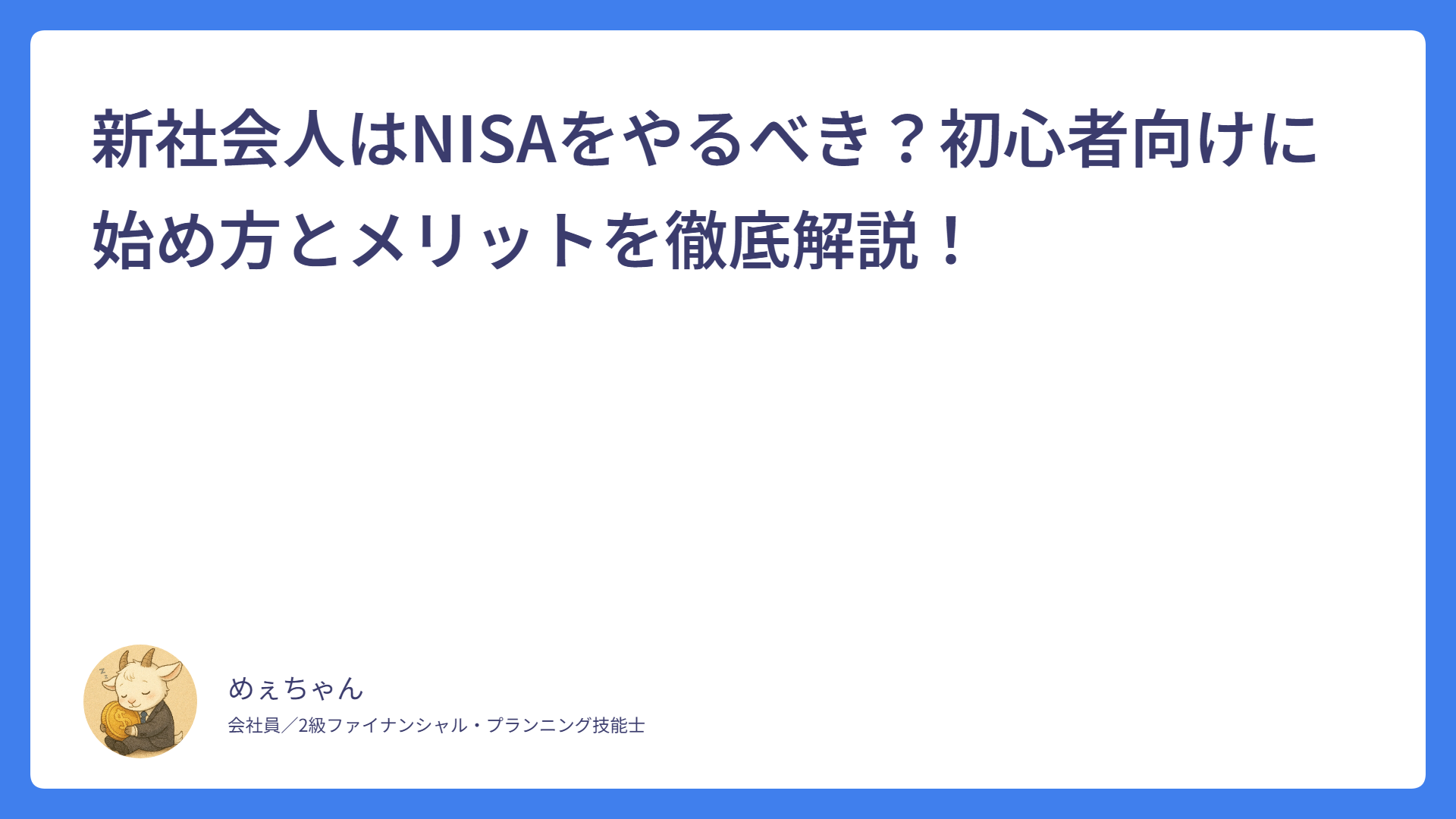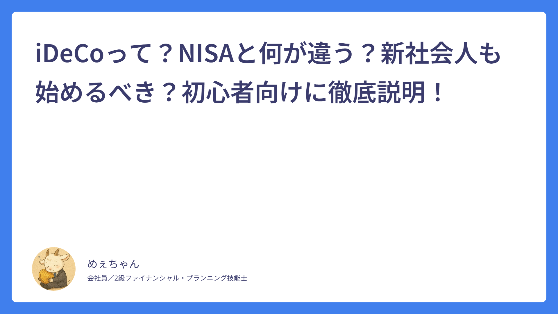 ARCHIVES 2025年12月 iDeCoって?NISAと何が違う?新社会人も始めるべき?初心者向けに徹底説明! 2025.12.28 iDeCo めぇちゃん サラリーマンFPめぇちゃんのライフプランブログ 新社会人はNISAをやるべき?初心者向けに始め方とメリットを徹底解説! 2025.12.20 NISA めぇちゃん サラリーマンFPめぇちゃんのライフプランブログ サラリーマンの味方!源泉徴収と年末調整について新社会人向けに基本を解説! 2025.12.14 税金 めぇちゃん サラリーマンFPめぇちゃんのライフプランブログ 所得税はどうやって決まる?所得税について新社会人向けに基本を解説! 2025.12.06 税金 めぇちゃん サラリーマンFPめぇちゃんのライフプランブログ