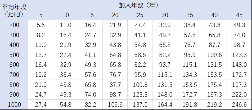 ※平均年収÷12で標準報酬月額を算定。標準報酬月額×0.005481×加入月数で計算。
