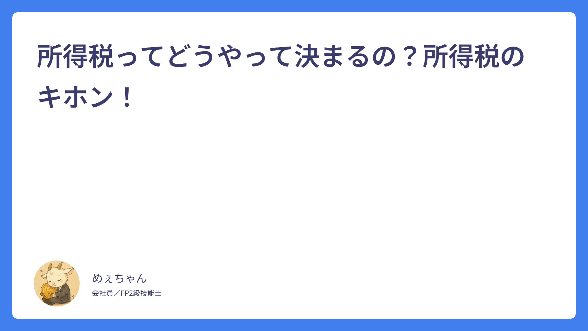 所得税ってどうやって決まるの?所得税のキホン! 2025.12.06 Uncategorized めぇちゃん サラリーマンめぇちゃんのライフプランブログ はじめまして!サラリーマンのめぇちゃんです! 2025.11.29 Uncategorized めぇちゃん サラリーマンめぇちゃんのライフプランブログ