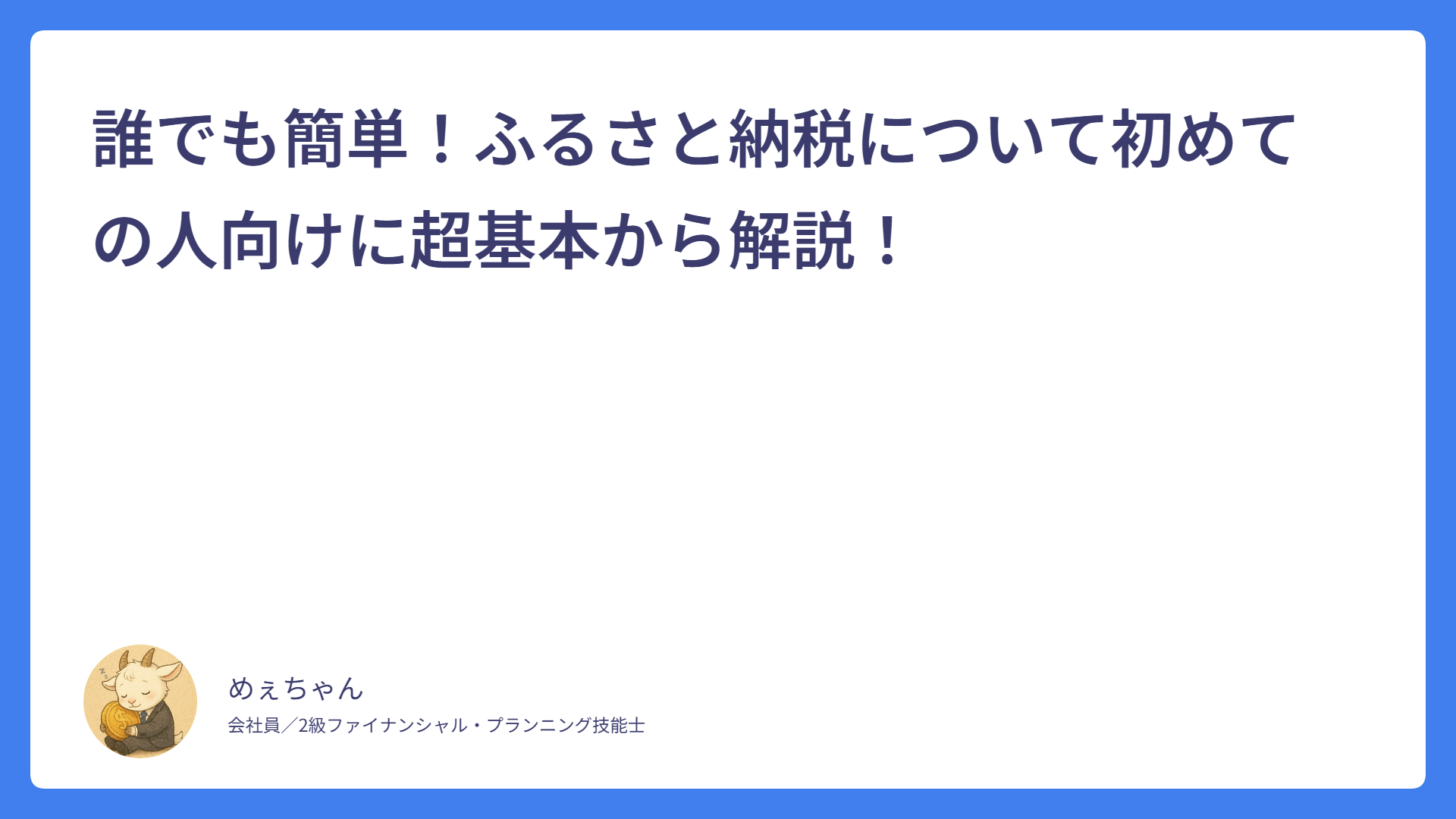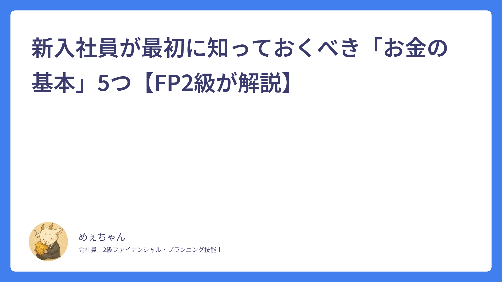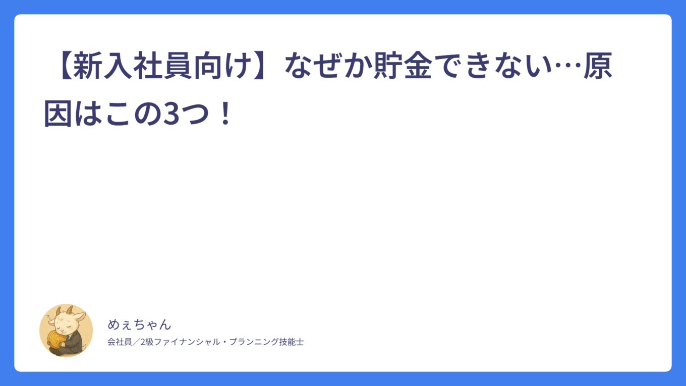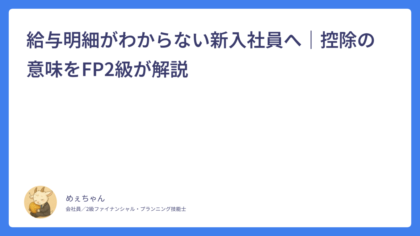 【新入社員向け】なぜか貯金できない…原因はこの3つ! 2026.01.30 新入社員 めぇちゃん サラリーマンFPめぇちゃんのライフプランブログ 給与明細がわからない新入社員へ|控除の意味をFP2級が解説 2026.01.27 新入社員 めぇちゃん サラリーマンFPめぇちゃんのライフプランブログ 新入社員が最初に知っておくべき「お金の基本」5つ【FP2級が解説】 2026.01.25 基本 めぇちゃん サラリーマンFPめぇちゃんのライフプランブログ 誰でも簡単!ふるさと納税について初めての人向けに超基本から解説! 2026.01.21 ふるさと納税 めぇちゃん サラリーマンFPめぇちゃんのライフプランブログ 持株会って?インデックス投資とどっちがいい?メリット・デメリット含めて徹底解説! 2026.01.14 インデックス投資 めぇちゃん サラリーマンFPめぇちゃんのライフプランブログ 業務中にケガをしたらどうする?公的保険「労災保険」の基本を解説! 2026.01.10 労災保険 めぇちゃん サラリーマンFPめぇちゃんのライフプランブログ 無駄な保険に入ってない?みんなが入っている最強の保険「公的医療保険」の基本を解説! 2026.01.03 医療保険 めぇちゃん サラリーマンFPめぇちゃんのライフプランブログ iDeCoって?NISAと何が違う?初心者向けに徹底説明! 2025.12.28 iDeCo めぇちゃん サラリーマンFPめぇちゃんのライフプランブログ NISAって?初心者向けに徹底解説! 2025.12.20 NISA めぇちゃん サラリーマンFPめぇちゃんのライフプランブログ サラリーマンの味方!源泉徴収と年末調整について新社会人向けに基本を解説! 2025.12.14 税金 めぇちゃん サラリーマンFPめぇちゃんのライフプランブログ もっと見る